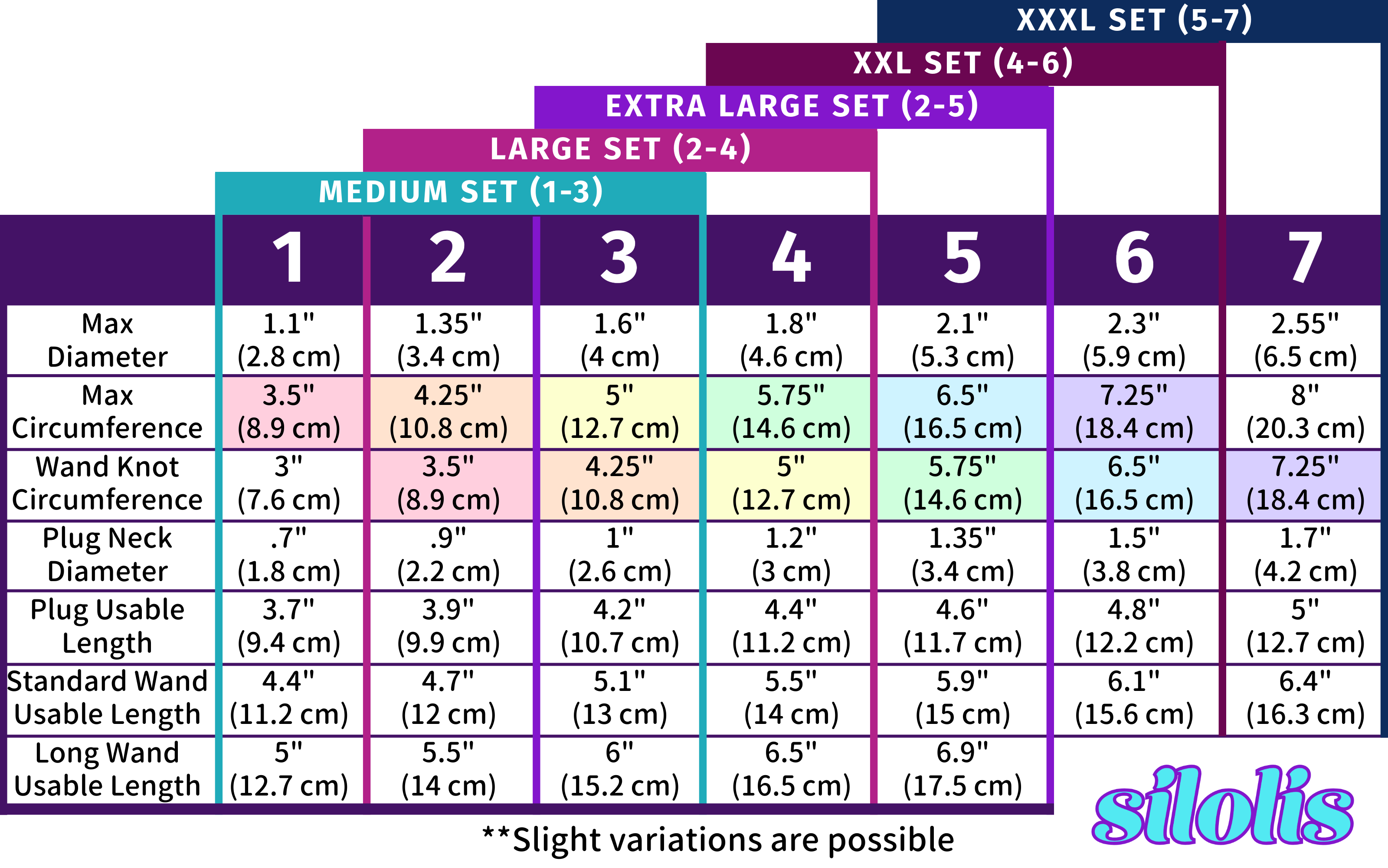 Finally, it's time to determine your girth goal. Remember, each size level (1-5) has a specific "max girth" each level's wand and plug have matching max girths. While designing our dilation system, we used actual penial girth statistics to choose the max girth for each size level- we've covered the whole range from the 1st percentile (level 1) to the 99.99th percentile (level 5).